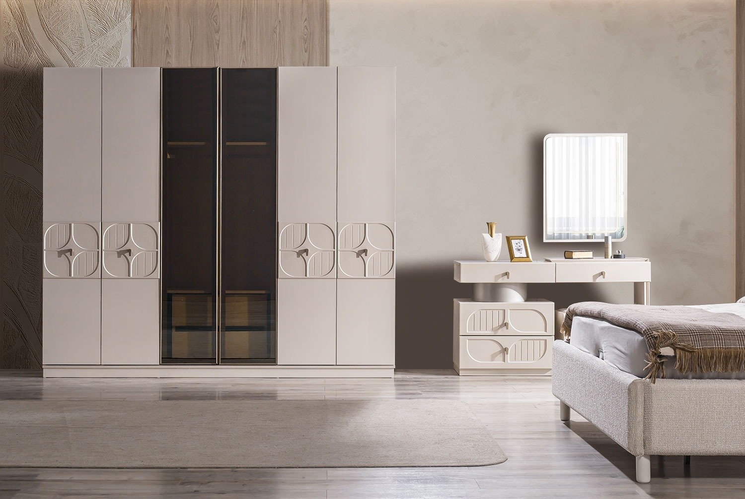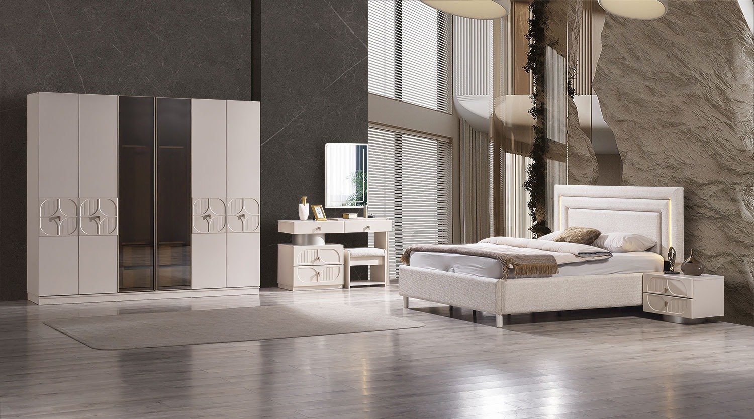 | TAKIM İÇERİĞİ | Bir gardırop, bir şifonyer, bir bazalı karyola, bir başlık,puf ve iki komodin den oluşmaktadır |