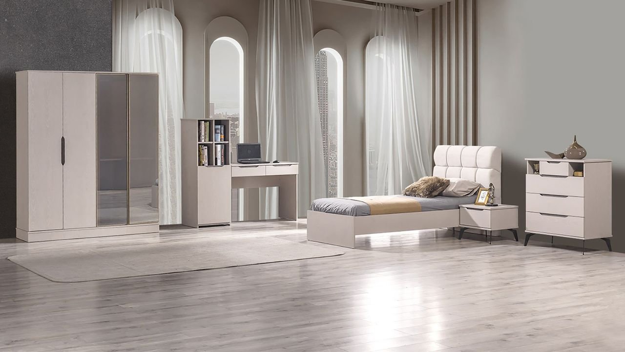 | TAKIM İÇERİĞİ | 1 Adet başlık ve karyola / 1 Adet gardolap/ 1 Adet şifonyer/ 1 Adet komodin/1 Adet çalışma masası |