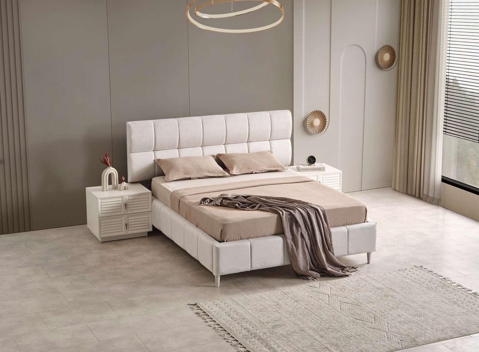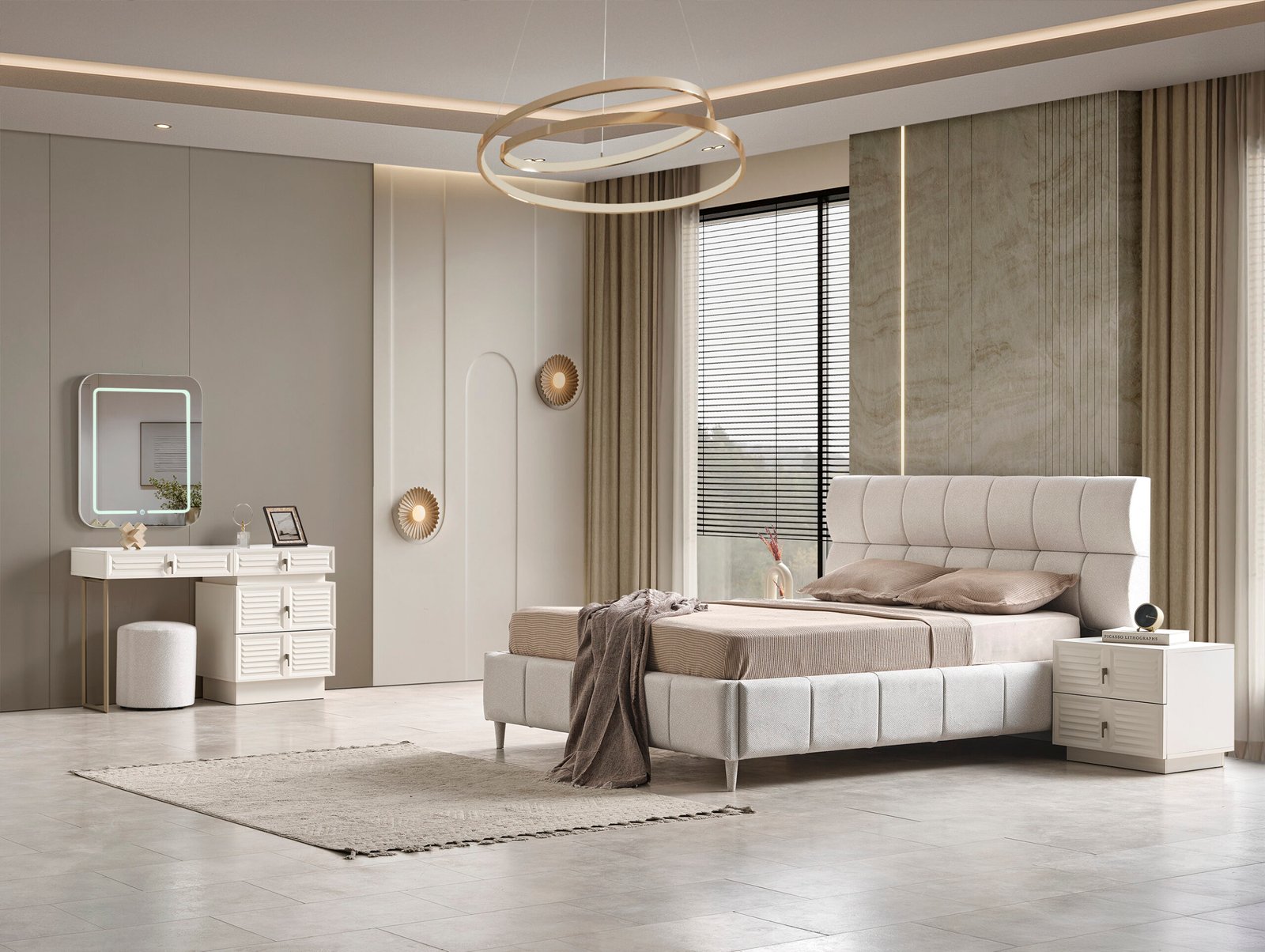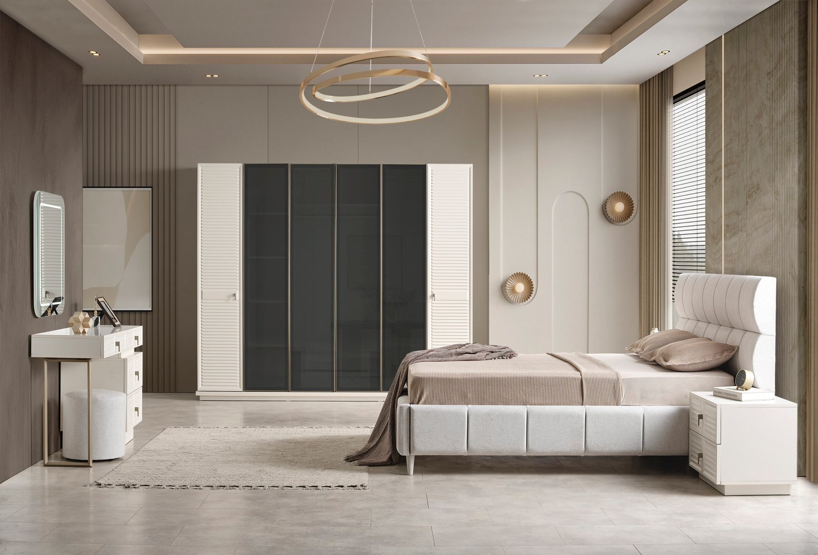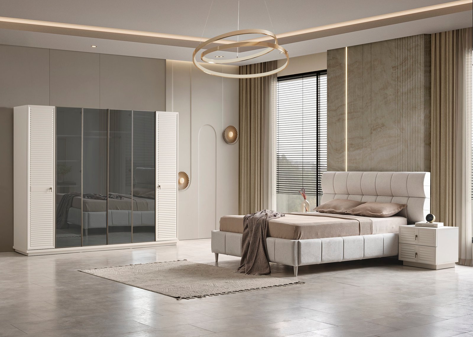 | TAKIM İÇERİĞİ | Bir gardırop, bir şifonyer, çelik iskelet solit baza, bir başlık ve iki komodin den oluşmaktadır |